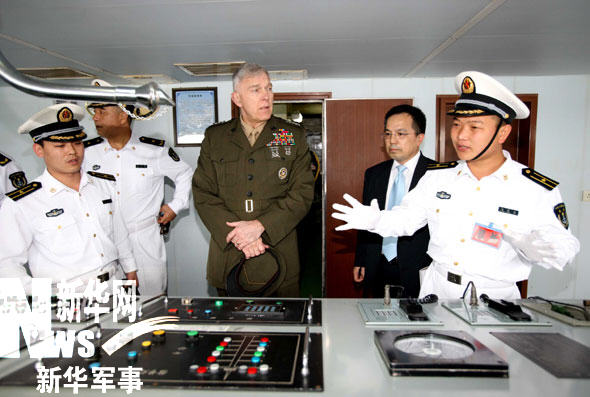 康威上将(中)参观中国海军新型登陆舰驾驶室 新华网记者查春明 摄