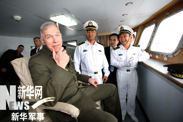 康威上将(左)风趣地坐在中国海军军舰舰长的座椅 新华网记者查春明 摄