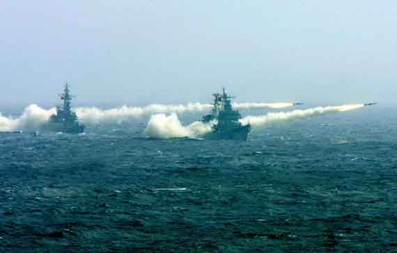 解放军海军战舰演习发射反舰导弹。[资料图片]