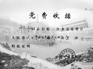 前不久,中组部委托广东省委组织部将一份特殊党费收缴凭证郑重地放到总参某部已故离休干部杨和的遗像前。2006年,杨和同志走完87年的人生旅程。他临终前留下遗嘱:“将省吃俭用节省下来的9万多元作为党费上交给党组织。”鲜红的证书随着一缕馨香,告慰这位对党无限忠诚的老干部的在天之灵。