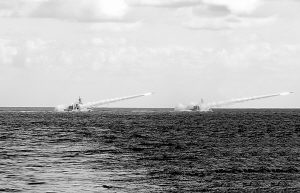 下午15时27分,515舰遭到“敌”舰艇编队突袭。与以往不同的是,过去只是通过“导弹来袭”口令进行导弹防御演练,这次雷达兵却在屏幕上真切地看到来袭导弹末制导雷达捕获我舰的强烈信号。“抗击来袭导弹!”指挥员一声令下,第一波干扰弹瞬间出筒,防空火力开始密集射击……