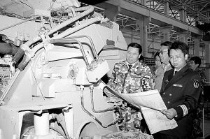 周炳武(左)和技术人员一起研究舰炮兼容发射方案。张志瑞摄