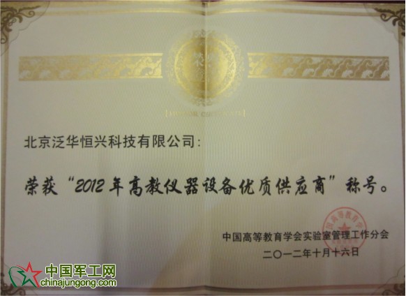 仪器设备优质供应商”评选活动在烟台落幕,由中国高等教育学会、中国高等教育学会实验室管理工作分会、中国教学仪器设备有限公司联合主办,北京泛华恒兴科技有限公司(简称:泛华恒兴)凭借其创新的产品和优质的服务荣获“2012年高教仪器设备优质供应商”称号。