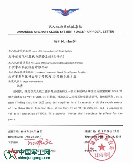 2017年8月28日,由北京中斗科技股份有限公司自主研发的“北斗低空飞行监视与服务系统”即“BD-cloud北斗云”正式获得中国民用航空局飞行标准司的运行批文,标志着该系统正式获得中国民用航空局运营许可,已经开始为行业和用户提供服务。